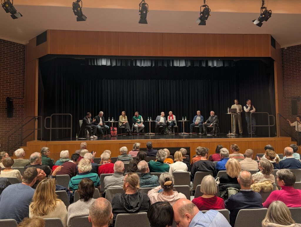 Auf Einladung der Klimainitiative Memmingen e.V. (KIMM) diskutierten Vertreter aller demokratischen Parteien im gut gefüllten Maximilian- Kolbe-Haus relevante Zukunftsthemen für den neu zu wählenden Stadtrat. Ziel der Klimainitiative und der kooperierenden Vereine ADFC, DAV Sektion Memmingen und Bund Naturschutz war es, die Themen erneuerbare Energien, Mobilität, Biodiversität und Wärmewende in den Wahlkampf zu tragen und die Positionen der Parteien kennenzulernen.